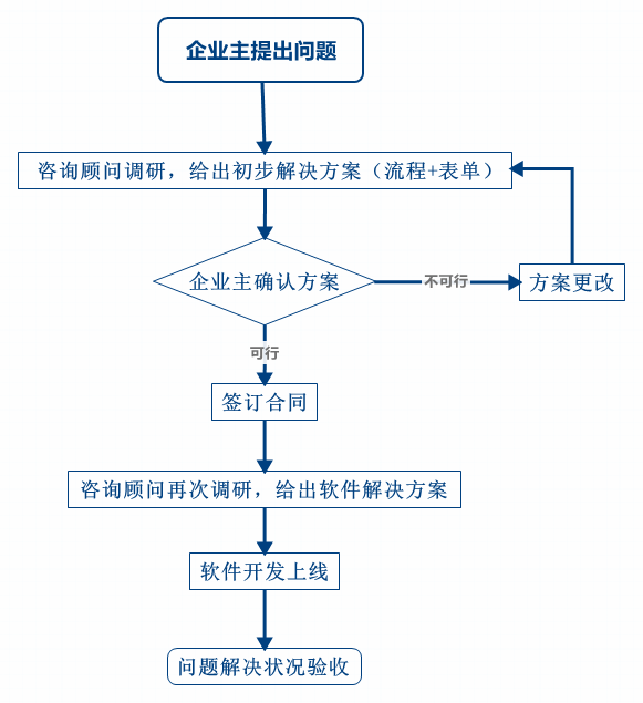 中小企业能快速适应市场需求,是其最大优势,但同时带来管理上的难题:由于灵活多变,没法形成固定的管理流程,导致职责不清、管理混乱等问题。对此我们提出,要立足于中小企业现实,根据当前环境、当前企业的发展阶段,首先解决主要矛盾。如何解决?一靠管理流程咨询提供策略,二靠IT系统落实策略,整个解决步骤如下: